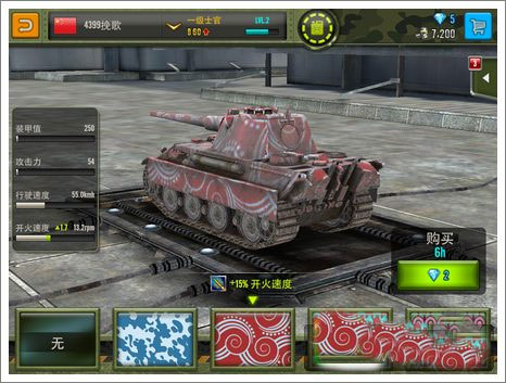 除了对坦克内部系统的改造升级,玩家还可以对坦克外观的纹理花纹进行修改喷涂。虽然挽歌不知道为什么,但是对外表的改装同时也有效果附加!涂装主要附加的是攻击力和攻击速度,玩家可以自由选择所需要的类型进行涂装,纹理图案多样,看得挽歌目不暇接。玩家可以以此打造出属于自己外观的不同战车。