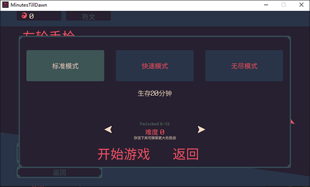 6、在这里,玩家需要选择好游玩的模式,标准模式为20分钟的生存时间,快速模式下,玩家将体验到快速的游戏方式,无尽模式中,玩家将尽最大努力生存下去,选好后就可以选择并点击“开始游戏”的选项继续了;