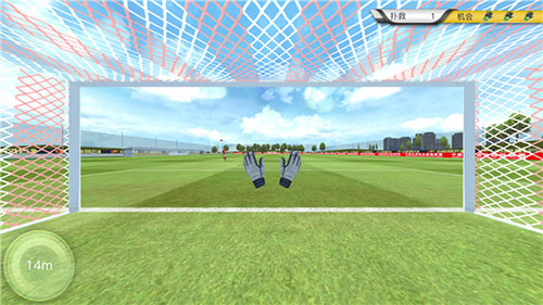 以门将的第一视角进行扑救,会有不同角度而来的射门,我们需要操纵手套移动到射门的方向即可成功扑救,扑救的球越多,门将的技能升级速度越快。