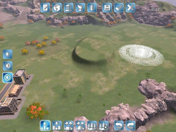 界面下方第二个按钮是降低地形,同样用笔刷的大小来控制提高的范围,用按住鼠标的时间长短来控制降低的多少,如图: