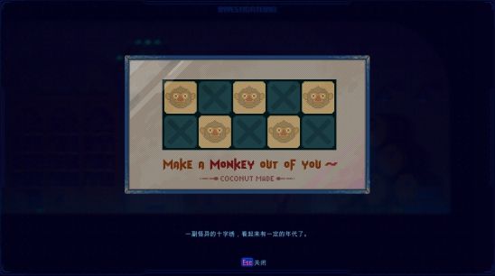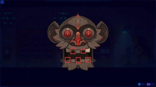 然后交互左边墙上的猴子面具,出现小游戏。这个游戏需要我们把猴子的牙齿按下,参照刚才看到的十字绣,把带叉的对应的牙齿按下去。