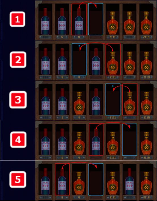 然后就要进行酒瓶换位的小游戏,需要我们把左边的蓝色酒瓶和右边的红色酒瓶的位置掉个个儿。整体是跳棋的玩法,即点击瓶子后,会跳入身边的空格,或者跳入隔一个瓶子的空格。解谜跳法如下图,以标注的数字顺序为步骤,依照箭头的指引移动瓶子。
