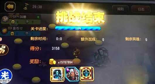 所有副本打完,右下角进度条提示100%后副本已完成,系统会自动将剩余时间,额外加成以及剩余英雄的分数归到总得分中,一个团队3个人的奖励是一样的,可以看出金币与灵魂石的奖励还是比较丰厚的。