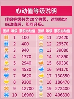 下图是心动值与对应等级,在姻缘树里也有相同数据,方便大家进行查询: