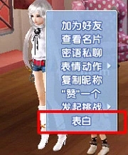 3、在房间中,右键单击心仪的Ta,选择“表白”(该选项在拥有情侣后自动消失)。