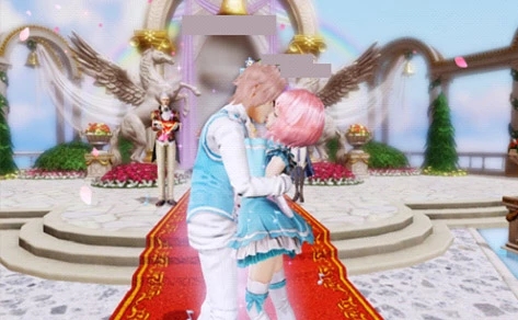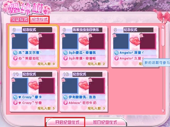 在双方都在线的情况下,可由其中一方前往“姻缘树”开启见证仪式,另一方点击接受后仪式房间正式开启。 开启成功后,系统向全服公布喜讯邀请玩家参与婚礼。