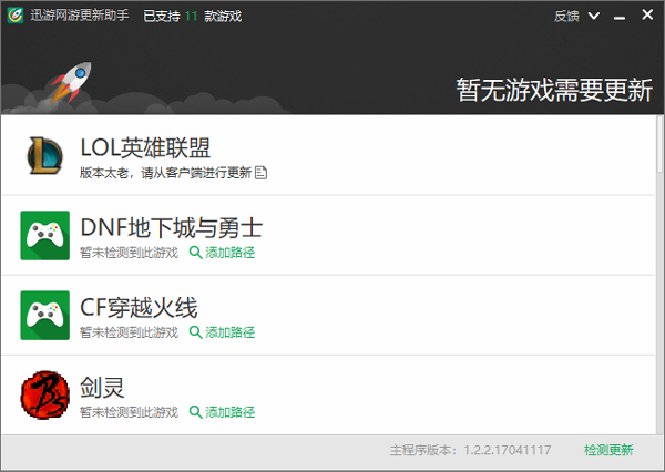 迅游网游更新助手是迅游网游加速器官方开发的一款游戏更新软件,该软件拥有更快的网游更新速度,能够支持lol英雄联盟、dnf、cf穿越火线、剑灵、天涯明月刀、逆战、fifa online3、cod使命召唤、怪物猎人、枪神纪、上古世纪等11款游戏快速安全稳定的更新,后继版本将添加更多游戏,送给有需要的朋友免费下载体验。