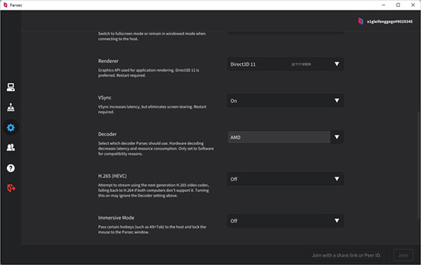 为了提高游戏体验,可以进入 Parsec 的设置,找到 Decoder 选择你的独立显卡、Renderer 选择 Direct3D 11、Vsync 垂直同步也建议开启。其它设置方面,上行带宽、帧率等就根据自己的情况来调整就行了;