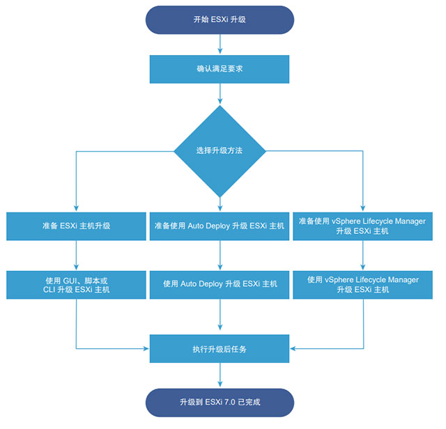 支持多种部署方式。ESXi 安装程序、脚本式安装以及采用预启动执行环境基于网络的安装。 这些脚本在 vSphere 主机本地运行,并且可以执行各种任务,例如配置主机的虚拟网络连接以及将其加入 VMware vCenter Server。