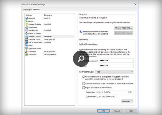 创建和控制与您的虚拟机有关的策略,并在 Workstation 12 受限虚拟机容器内为终端用户提供应用。通过限制对 Workstation 虚拟机设置的访问(例如拖放、复制和粘贴以及连接 USB 设备)来保护公司内容。此外,还可以对虚拟机进行加密和密码保护,以确保未经授权的用户无法篡改企业虚拟机设置。
