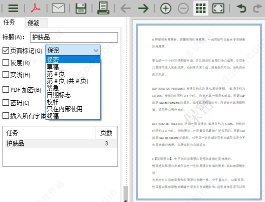 一、 使用页面标记功能如图所示,软件专业版的水印添加功能位于软件左侧任务面板的页面标记中。用户勾选“页面标记”,就可以在其下拉菜单中找到“保密”、“只在内部使用”等水印