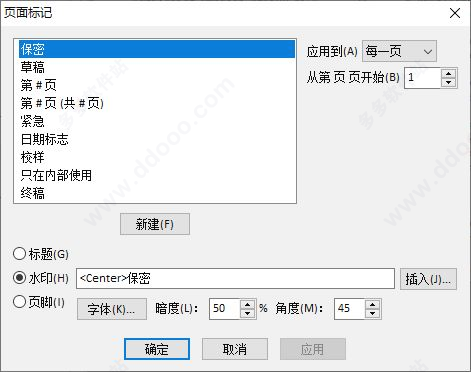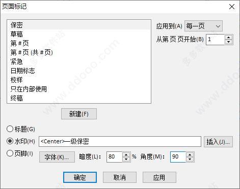 比如,可以将“保密”页面标记重新设置为文字内容为“一级保密”的、80%暗度、90度角的水印标记。