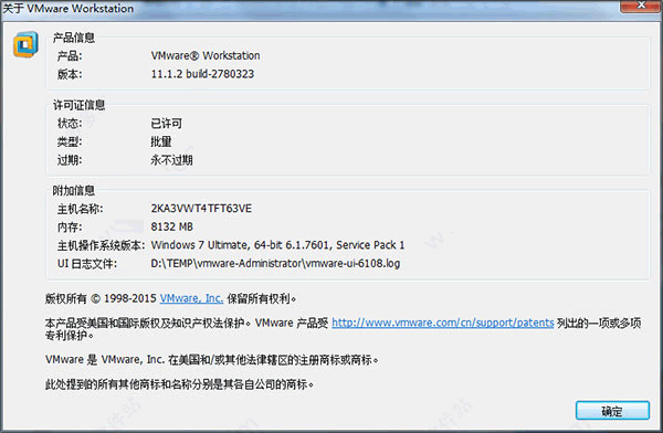 7、弹出许可密钥,输入VMware11密钥:1F04Z-6D111-7Z029-AV0Q4-3AEH8即可完成激活;