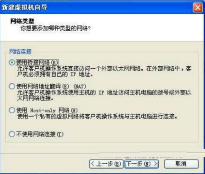 在“新建虚拟机向导”对话框中一路点击“下一步”按钮,进入“网络类型”对话框后,就可以选择你所使用的工作模式。在“网络类型”对话框中有四个单选项,分别为bridged(桥接)模式、NAT模式、hst-only模式、不使用网络连接,选择你需要使用的工作模式后,点击“下一步”按钮,就可完成虚拟系统工作模式的配置。