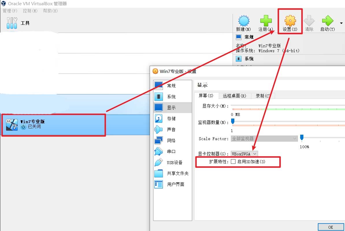 2、关闭虚拟机,然后打开 设置,切到 显示 选项卡,显示卡控制器选择VBoxSVGA,然后打开 启用3D加速,如果下面提示发现无效设置,则需要把显存大小调到128M以上,也就是青色横条的位置;