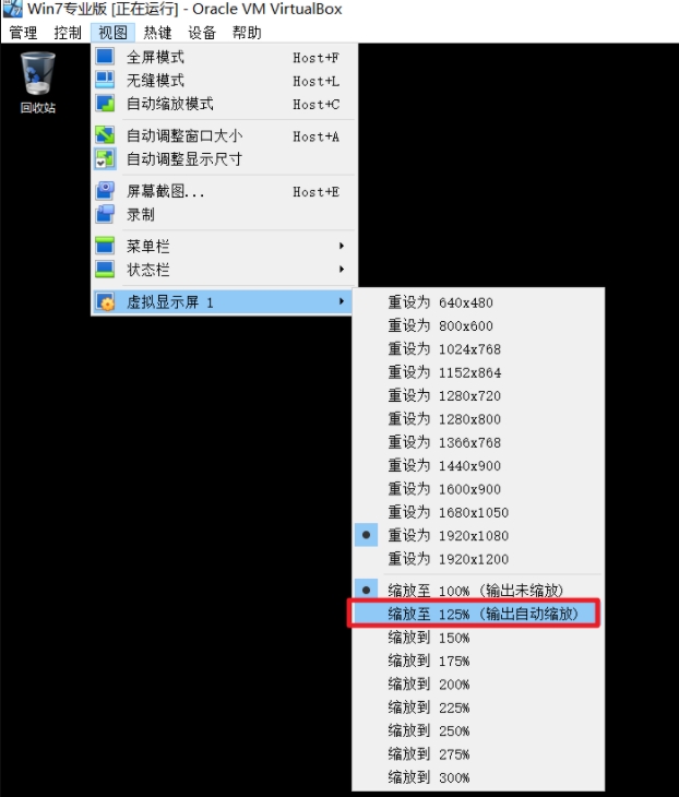 4、此时重设为1920x1080之后,虚拟机屏幕的长度,超过主机的长度,别慌,打开 视图->虚拟显示屏->缩放至XXX%(输出自动播放);