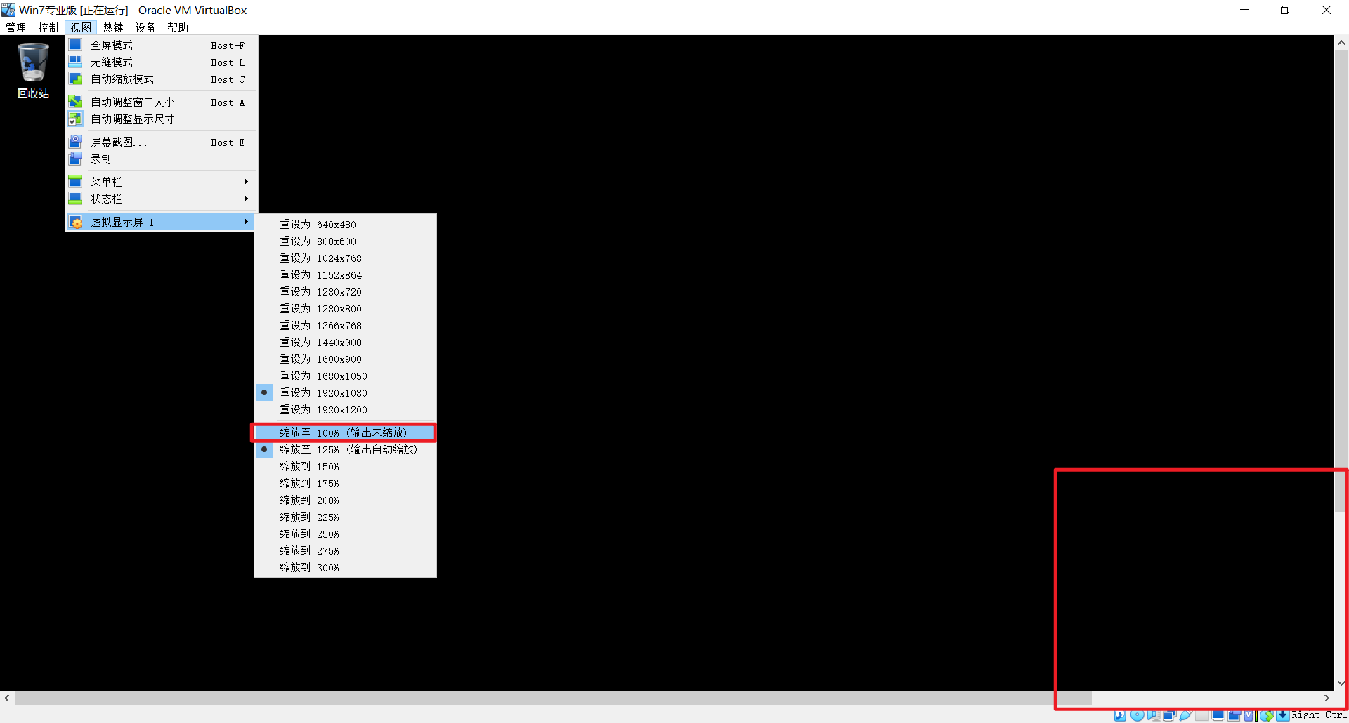 6、重新调整分辨率后,发现整个屏幕变成了又模糊又有滚动条,别急,打开 视图->虚拟显示屏->缩放至100%(输出未缩放);