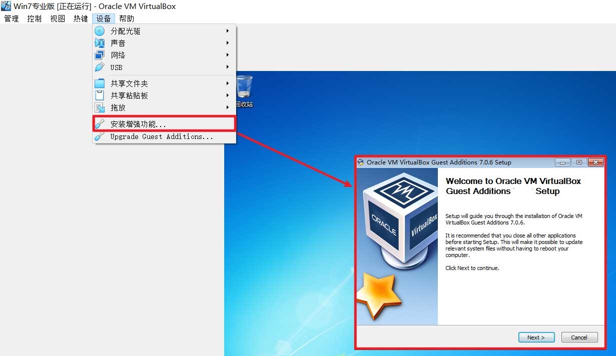 1、安装VirtualBox Guest Additions增强功能,一直next即可,完成后,点击finish按钮会重启虚拟机;