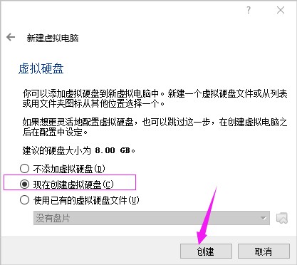4、在打开的界面中保持默认设置,单击“创建”按钮,新建一个虚拟硬盘。