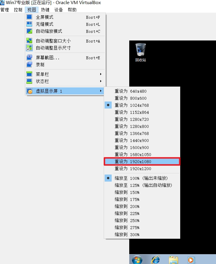 3、打开虚拟机,打开 视图->虚拟显示屏->重设为… ,这里设置成你主机的屏幕分辨率即可,因为我主机的屏幕分辨率是1920x1080,所以我这里选择重设为1920x1080;