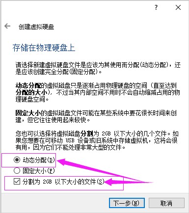 6、选择磁盘分配类型。本例选择“动态分配”单选钮,然后单击“下一步”按钮。