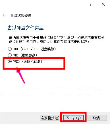 5、在打开的界面中选择虚拟磁盘文件类型,本例选择“VDI(VirtualBox磁盘映像)”单选钮,然后单击“下一步”按钮。