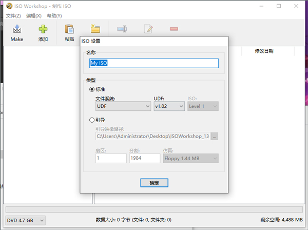 ISO Workshop允许您从本地文件和文件夹创建ISO映像。您可以使用各种文件系统或可引导ISO映像制作标准ISO映像,以准备引导光盘。