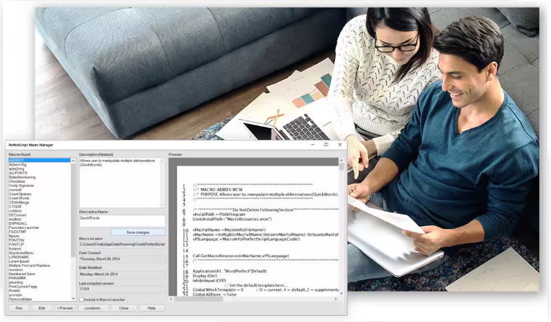 在需要时使用宏管理器立即使用宏。此对话框将所有 WordPerfect 宏显示在一个方便的位置。现在,您可以查看每个宏的属性、添加说明以及运行或编辑宏。