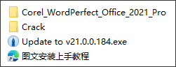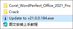 1、下载解压,得到Corel WordPerfect Office Professional 2021原程序、更新补丁,以及crack激活文件;