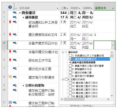 project2019无需再记住要链接到的任务的 ID。反之,如果选择“前置任务”列中的单元格,然后选择向下箭头,将看到项目中所有任务的列表。任务层次结构和顺序与项目完全匹配,使你能够轻松滚动到右侧的任务,并选择旁边的复选框。