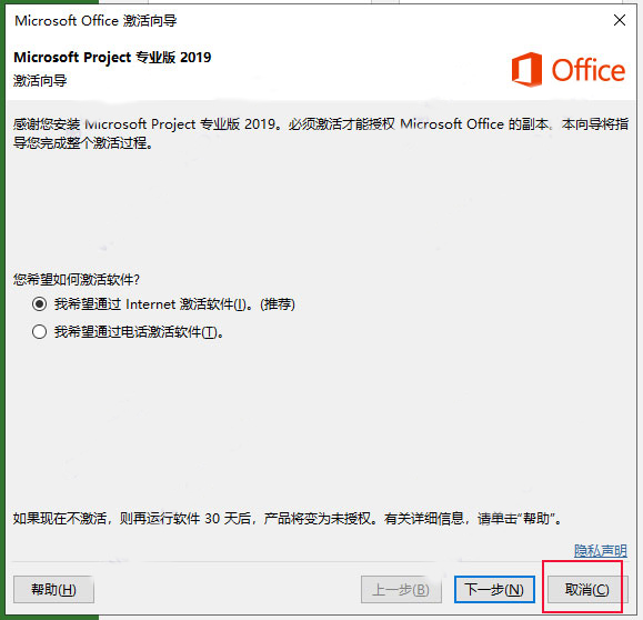 8、弹出激活方法,这里点击取消,等下用激活工具激活;