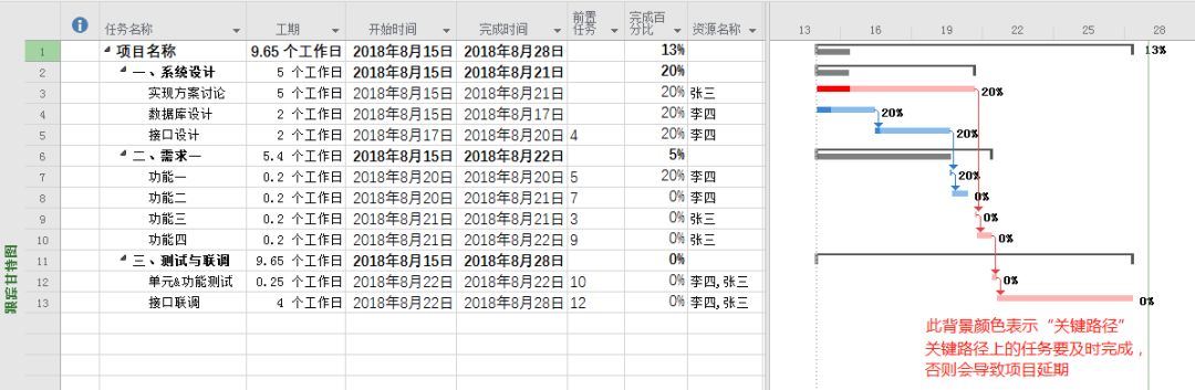 跟踪甘特图会显示出“关键路径”,关键路径上的任务要及时完成,否则会导致项目延期