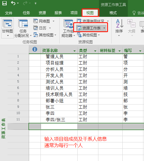 视图 -> 资源工作表,录入项目组相关成员信息(非自研产品类项目,可以录入其它资源)