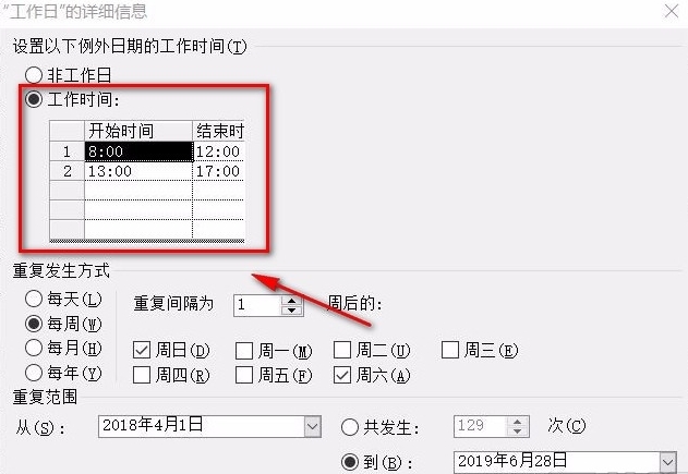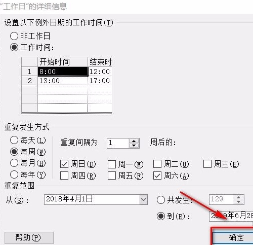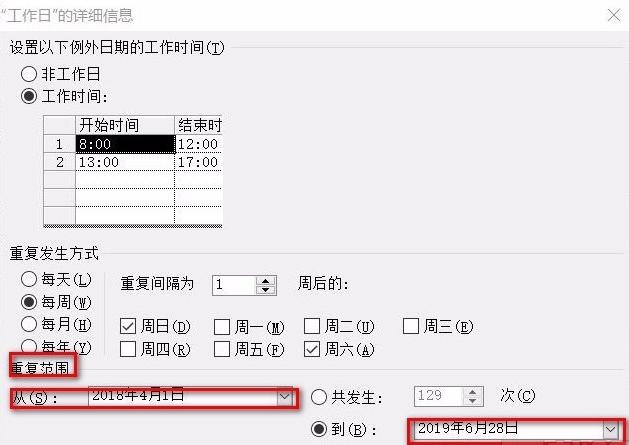 6、接下来在窗口底部找到“重复范围”选项,我们根据自己的需要,在其下方的两个文本框中分别输入周六周日设置为工作日的开始日期和结束日期。