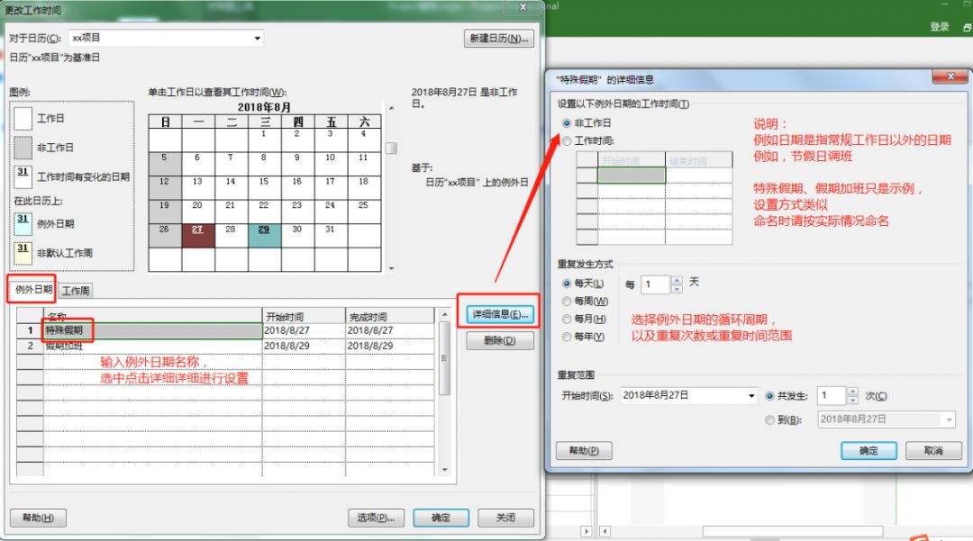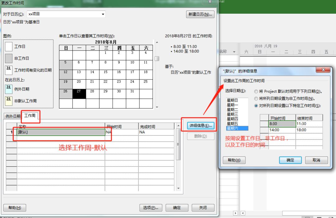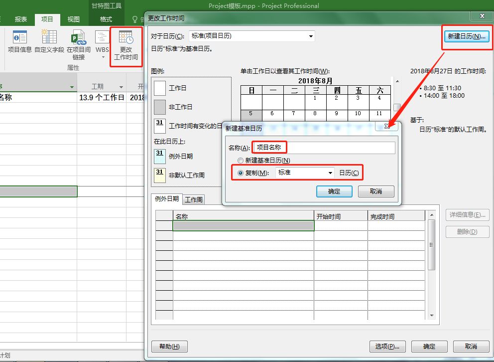 项目 -> 更改工作时间,新建日历:一般以项目名称进行命名