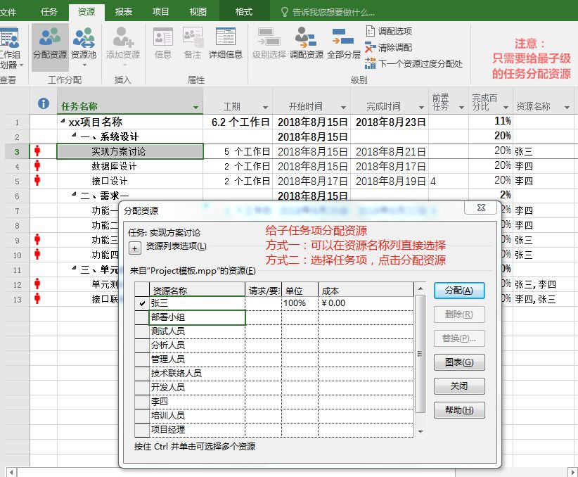 资源 -> 分配资源,只需要给最子级的任务分配好人员即可