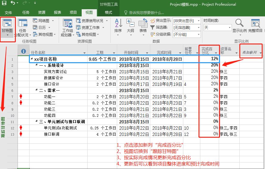 视图 -> 跟踪甘特图,添加“完成百分比”列,视图切换到“跟踪甘特图”