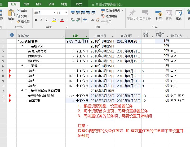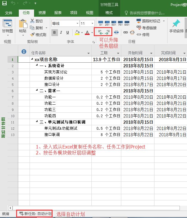 任务,给第二步收集到的功能清单,录入到设置好基础信息的Project文档,并调整好层级关系