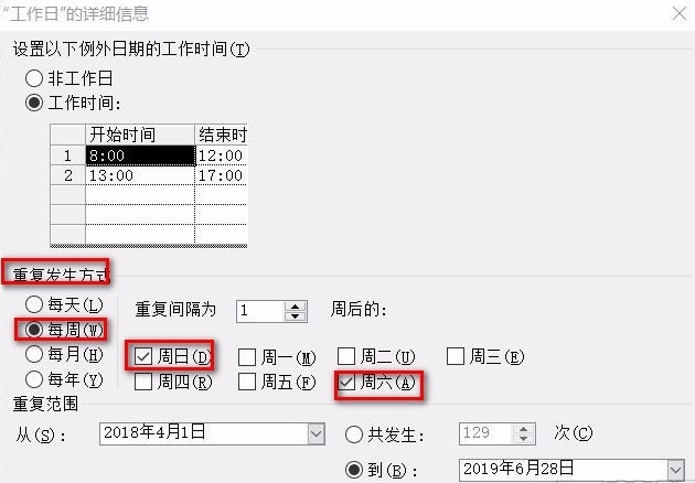 5、在窗口中还可以找到“重复发生方式”选项,我们在该选项下方选择“每周”,并勾选“周六”、“周日”。