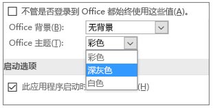 现在可以向 Project 2016 应用三种 Office 主题:彩色、深灰色和白色。 若要访问这些主题,请转到“文件”>“选项”>“常规”,然后单击“Office 主题”旁的下拉菜单。