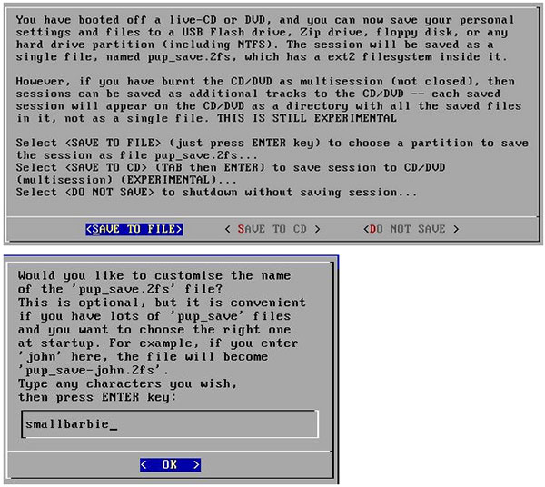点击:开始 | 关机 | 重启 ,重启puppy linux系统,在关机前会有提示是否要保存session会话,选"Save_to_File",保存文件名为pup_save-XXX.2fs,大小建议为512MB以上。