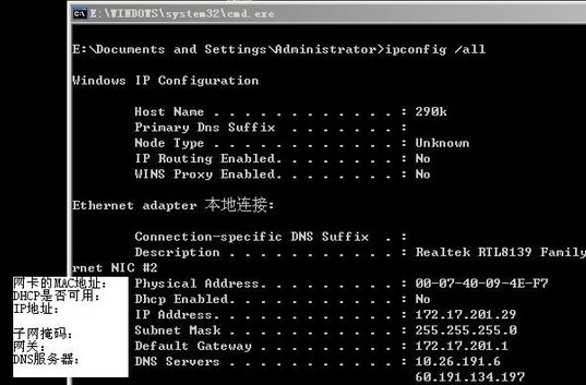 在win的dos控制台下输入: ipconfig /all 后: