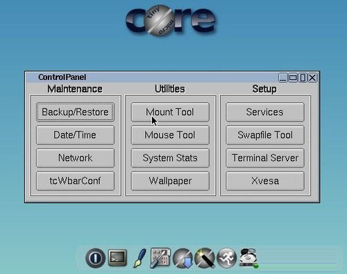 Tiny Core这只小麻雀,人们为何说它是五章俱全呢?这是因为它将所有的应用和工具管理都尽量的压缩和简化。基本上,Tiny Core所有的功能都是通过“控制面板(ControlPanel)”来实现的。Tiny Core集中了管控这些系统的各种管理功能的模块。