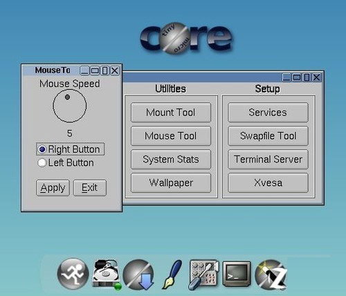 同时,对于Tiny Core系统日常的操作亦有操作工具。例如,鼠标、背景设置等,“控制面板(Controlpanel)”也能做到轻松控制。对于鼠标可以控制移动速度,单击圆圈中的黑色圆点,顺时针转动则加快速度,逆时针转动则降低速度。