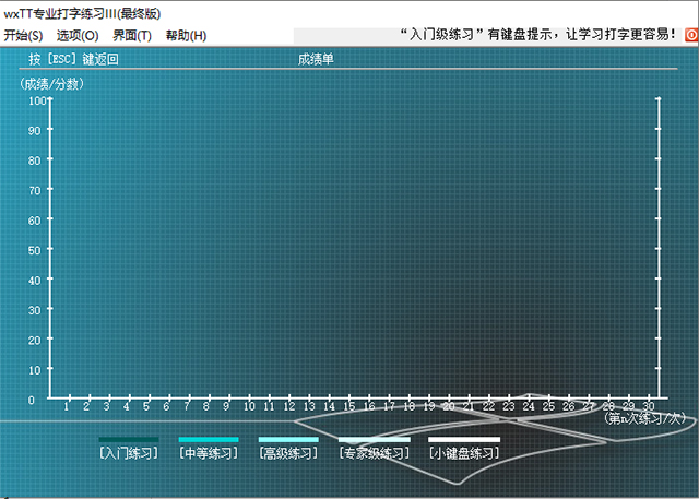WXTT专业打字练习是一款专业的打字练习工具,它包含了多种级别的练习模式,适合各个级别使用者练习,而且还能进行小键盘练习。键盘分布图让你熟练的运用键盘的每个位置,养成良好的打字习惯。同时成绩单记录能让你直观的看到自己的进步过程,让你能持续的坚持下去,对于想要学习打字的朋友,这是非常值得使用的软件,赶紧来下载吧。