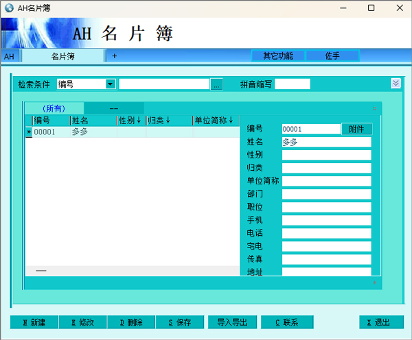 AH名片簿是一款非常不错的名片管理软件,秉承着AH系列软件新颖、实用、便捷的特点,是一款人人都适用的傻瓜式操作的通讯录名片管理软件。该软件界面新颖友好,直观简洁,任意条件模糊查找,在提供名片管理的同时并提供电话拨号,发送短信等一些实用功能,支持导入导出数据。如果您在寻找同类的名片管理软件的话,建议您下载本站提供的AH名片簿,它强大的功能绝对会给你最合适的操作。