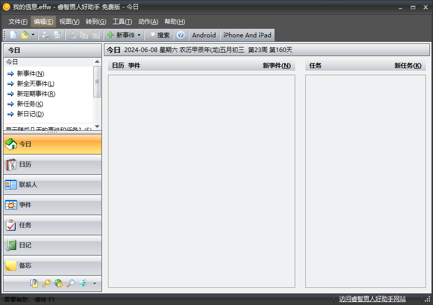 睿智男人好助手是集通讯录、日程安排、任务计划、公历农历、电子日记、便笺备忘、密码管理、网址收藏等诸多功能于一身的个人信息管理软件。软件具有集成化的界面,统一的操作方式。您无需分别打开几个不同的程序来管理您的个人事务。