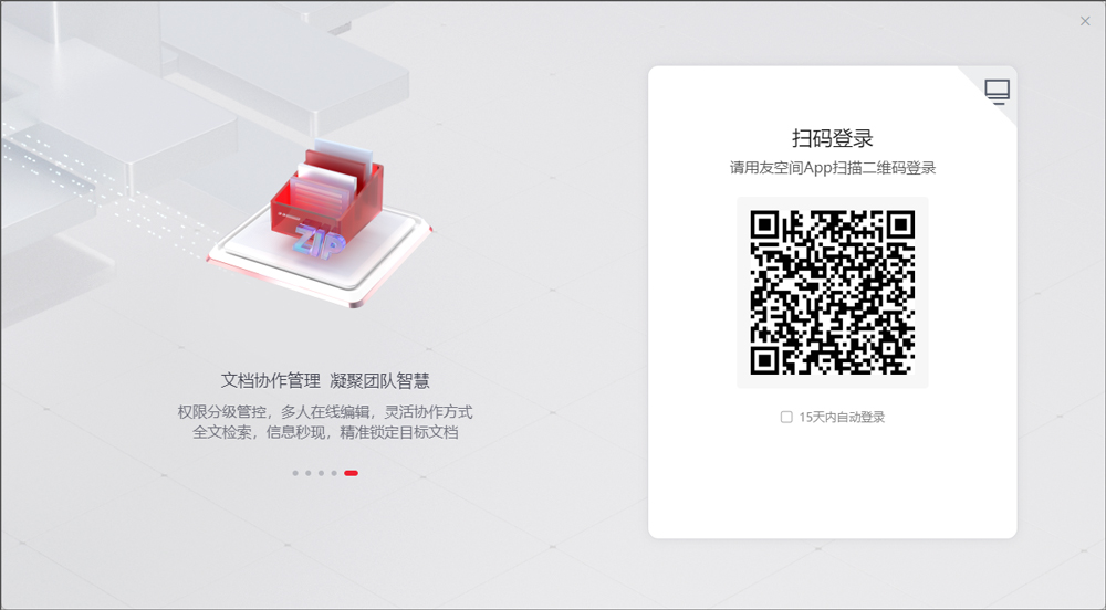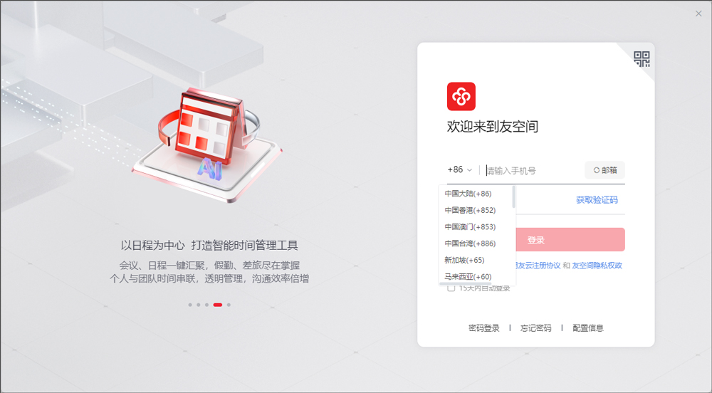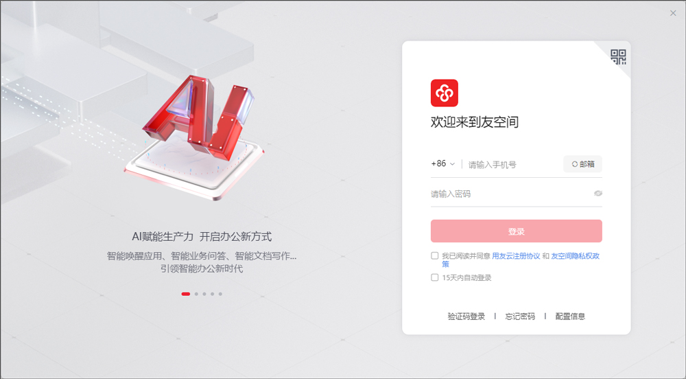 1、打开友空间pc客户端,软件支持手机号和邮箱登录;