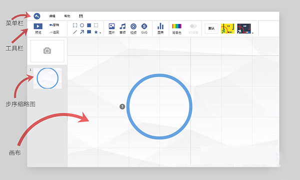 3、AxeSlide的窗口分可为菜单栏、工具栏、步序栏、画布四大部分,如下图所示: