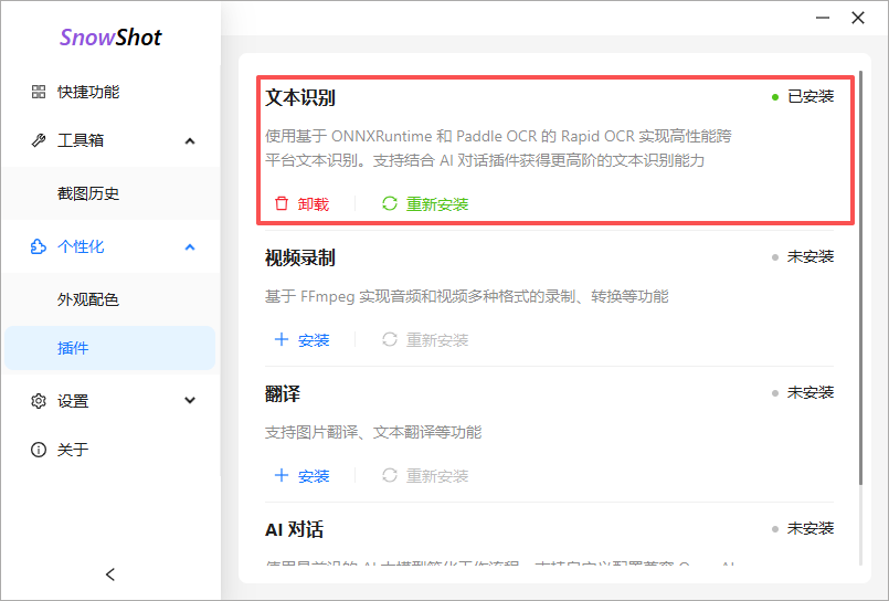 5、Snow Shot 的文本提取功能通过下载文本识别插件开启,启动后将激活强大的 OCR(光学字符识别)能力,让您能够快速从图片、截图中提取文字内容。无论是处理文档、识别图片文字还是提取屏幕内容,文本提取功能都能为您提供高效准确的识别服务。